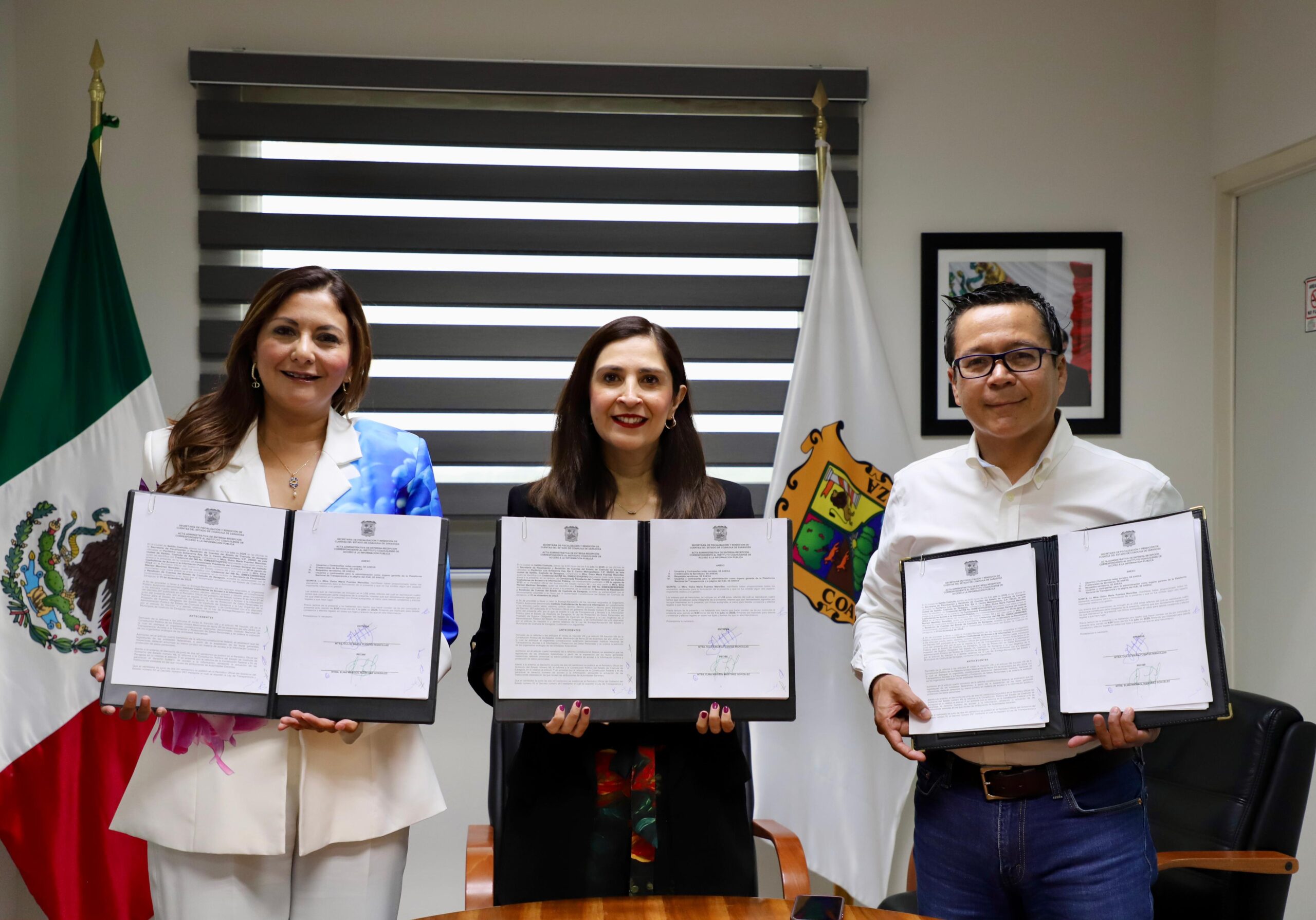 Saltillo, Coah., 3 de julio de 2025.- Con la firma del Protocolo de los Recursos Materiales, Informáticos y Sistemas de la Plataforma, inició el proceso de entrega- recepción del Instituto Coahuilense de Acceso a la Información Pública (ICAI) a la Secretaría de Fiscalización y Rendición de Cuentas (SEFIRC).