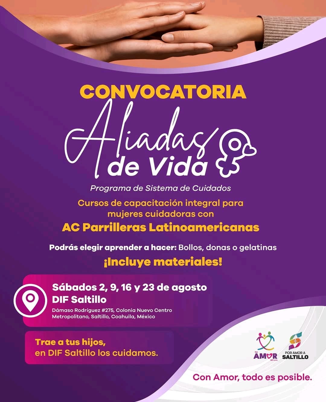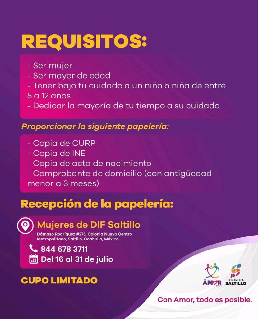 Saltillo, Coah., 18 de julio de 2025.- el DIF Saltillo ha abierto la convocatoria para su programa «Ayudas de Vida», dirigido a mujeres cuidadoras de niños entre 5 y 12 años. Los requisitos incluyen ser mayor de edad, proporcionar documentación como CURP, INE, acta de nacimiento y comprobante de domicilio, y entregarla del 16 al 31 de julio en las instalaciones del DIF Saltillo, ubicadas en Dámaso Rodríguez #275, Colonia Nuevo Centro Metropolitano.