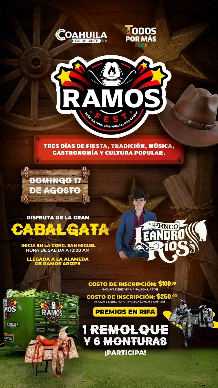 El domingo 17 de agosto se realizará la esperada gran cabalgata, que partirá desde la congregación San Miguel a las 10:00 de la mañana, con llegada a la Alameda de Ramos Arizpe. Esta actividad reunirá a cientos de jinetes de la región, en un ambiente de fiesta y convivencia familiar.