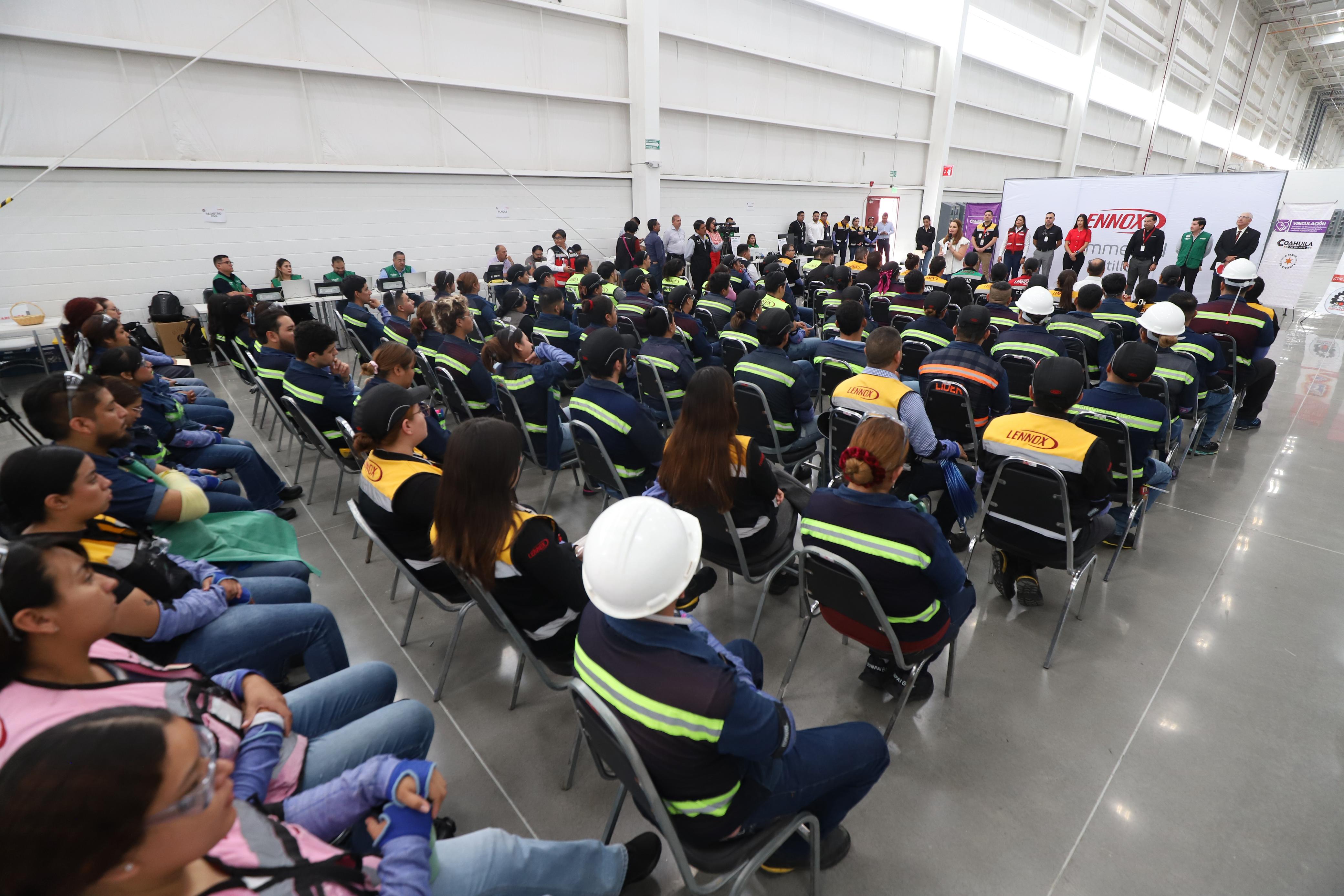 Ramos Arizpe, Coah., 3 de septiembre de 2025.- Con el objetivo de que la fuerza laboral de Coahuila aproveche los servicios que brinda el Gobierno del Estado como Registro Civil, placas y licencias, entre otros, la Secretaría de Vinculación Ciudadana, Proyectos de Innovación Social e Inversión Público Productiva, en conjunto con Mejora Coahuila llevaron una brigada a la empresa Lennox, en Ramos Arizpe.