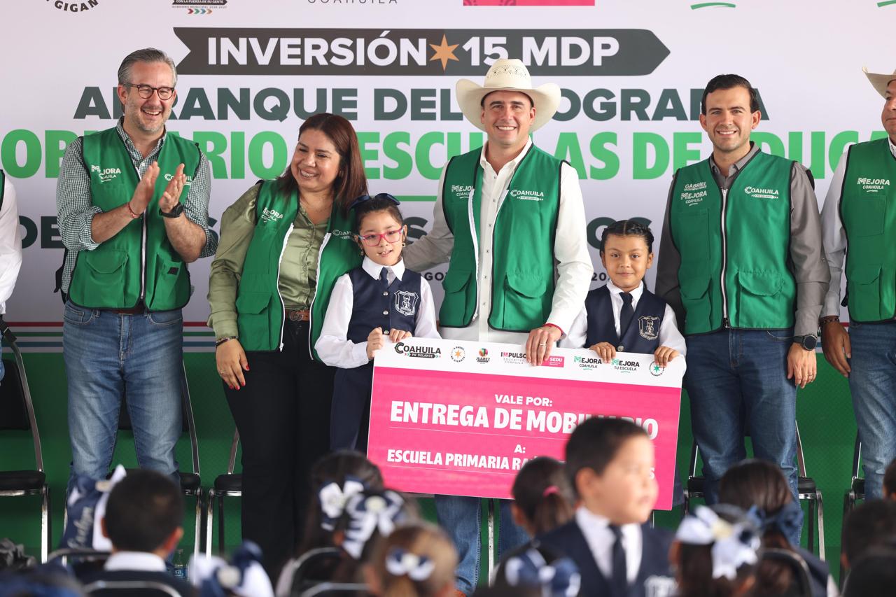 Manolo Jiménez destacó que la puesta en marcha del programa de Entrega de Mobiliario a Escuelas de Educación Básica es relevante porque se sigue fortaleciendo la educación en Coahuila, como parte de las acciones de la estrategia transversal Impulso Educativo para fortalecer la educación de nuestro estado, que se presentó hace más de un año y al cual se le invierten mil millones de pesos cada año de manera aproximada.
