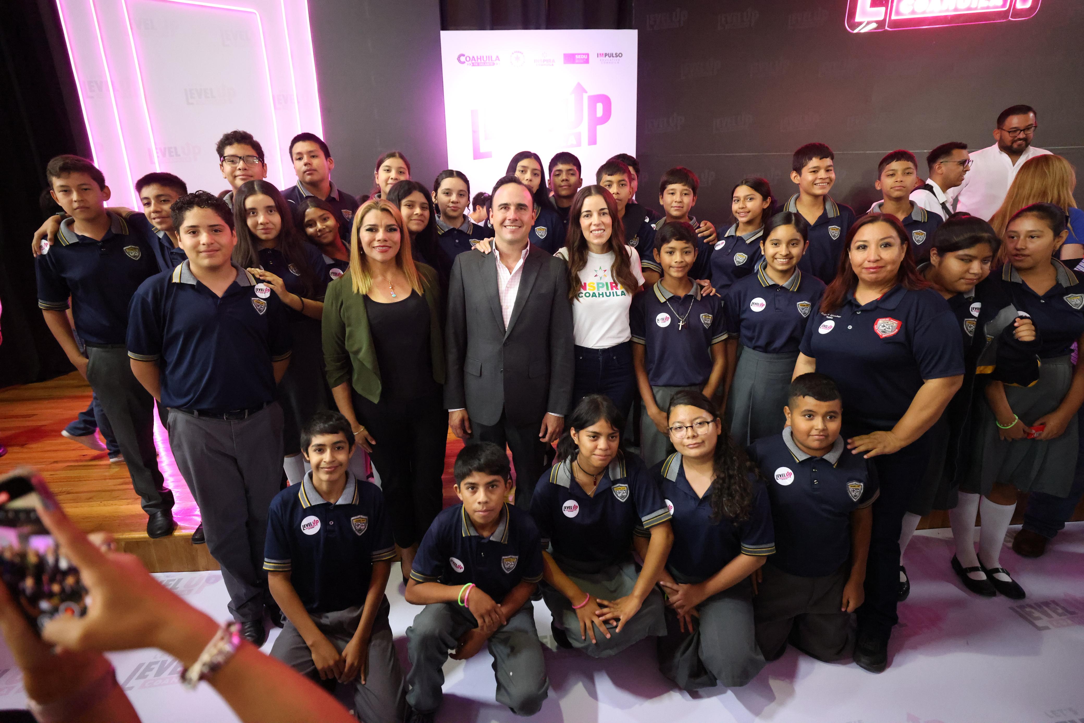 “Lo que vemos hoy es una realidad que está llegando a cada rincón de Coahuila. A partir de este ciclo escolar el programa de Level Up está en todas las primarias que cuentan con maestro de inglés, en el cien por ciento de las secundarias del estado el programa ya es una realidad; y a partir de enero se incorporan al cien por ciento de los bachilleratos estatales, Cobac, Cecytec y Conalep, y también el cien por ciento de nuestras universidades públicas, normales, politécnicas, tecnológicas e institutos tecnológicos”, informó.