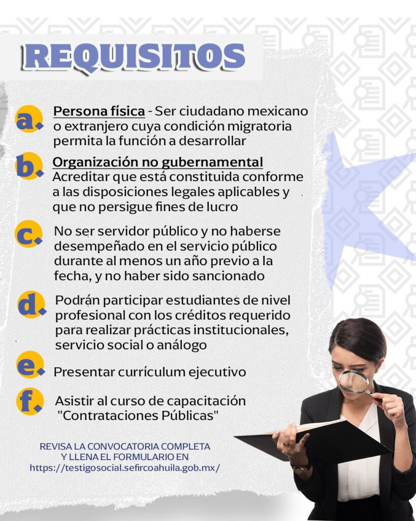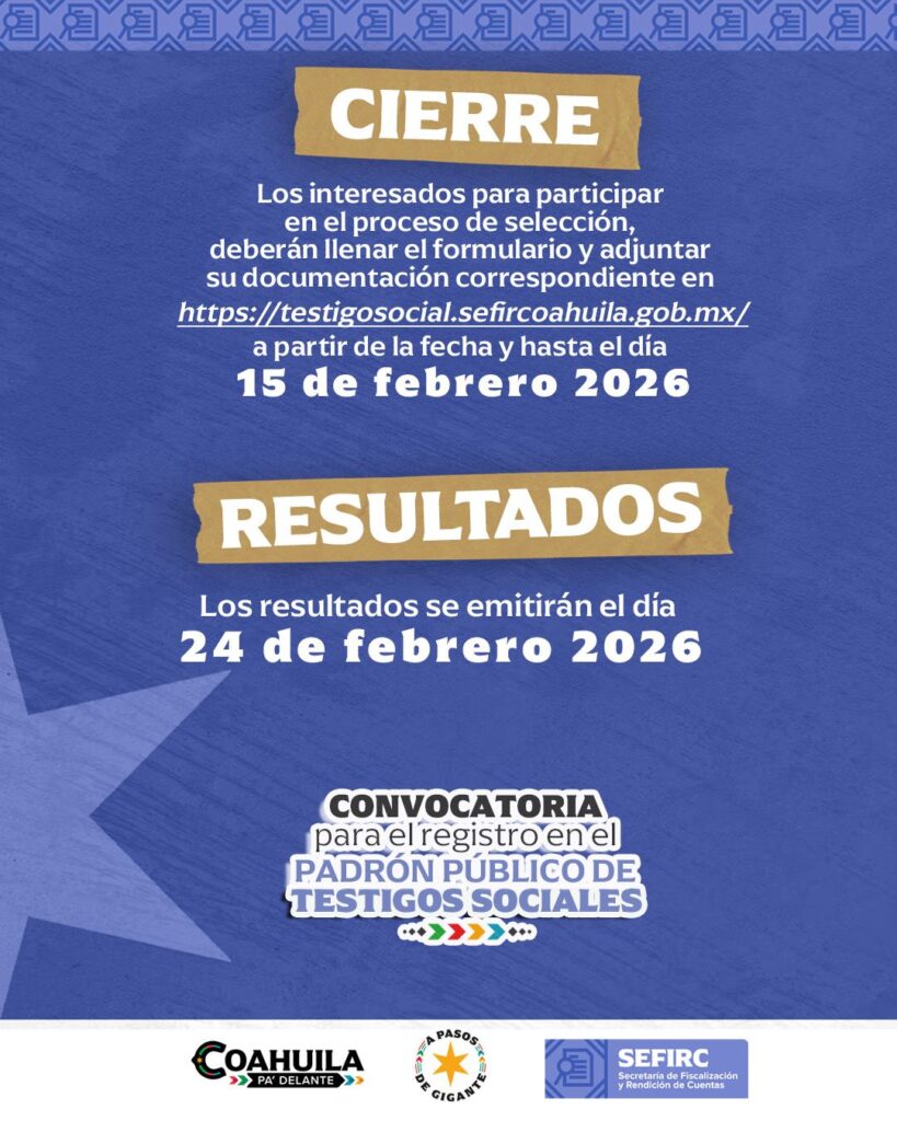 Personas Físicas y Organismos No Gubernamentales tienen hasta el próximo 15 de febrero del presente año para llenar el formulario y adjuntar la documentación requerida por medio del sitio web https://testigosocial.sefircoahuila.gob.mx/