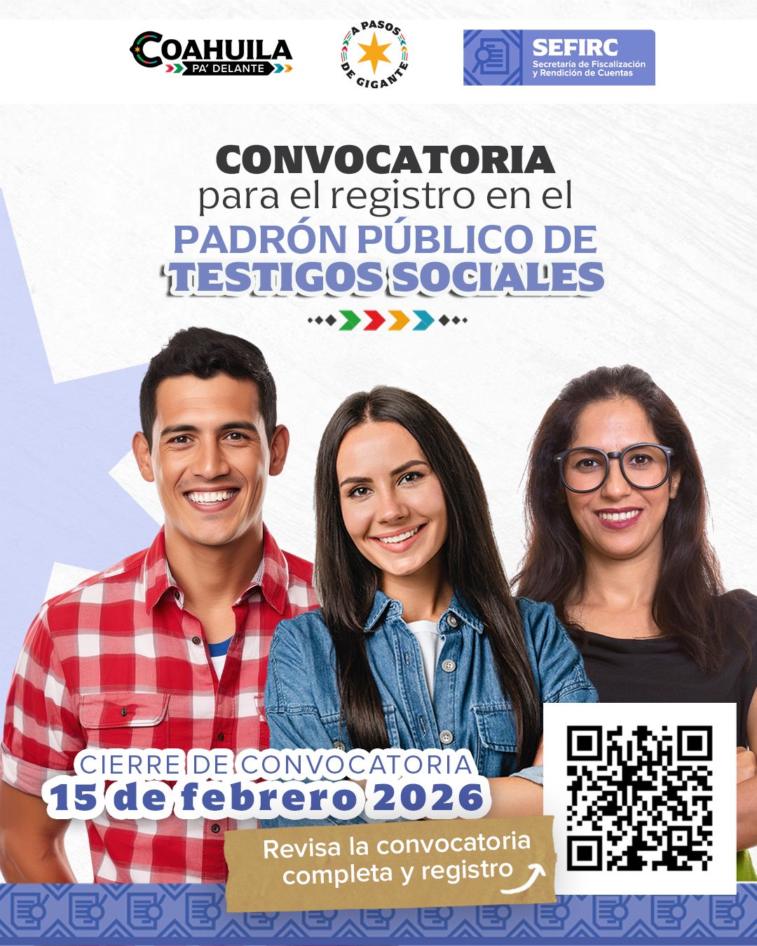 Saltillo, Coah., 23 de enero de 2026.- Al enfatizar la importancia de la participación ciudadana en la vigilancia del uso de los recursos públicos, la Secretaría de Fiscalización y Rendición de Cuentas (SEFIRC) reiteró la invitación para postularse en el Padrón Público de Testigos Sociales de las contrataciones del Gobierno del Estado de Coahuila.