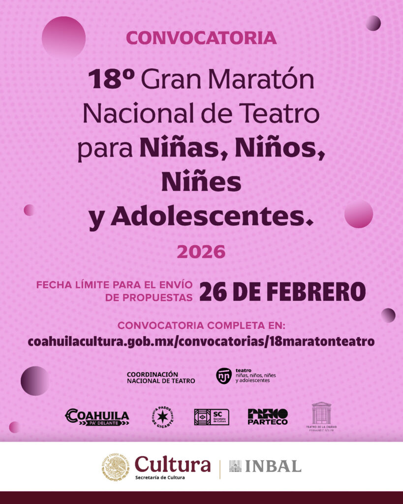 Saltillo, Coah., 21 de febrero de 2026.- El Gobierno del Estado de Coahuila a través de la Secretaría de Cultura realiza dos importantes convocatorias para el área de teatro, en coordinación con la Secretaría de Cultura Federal, a través del INBAL y la Coordinación Nacional de Teatro, en las que se invita a compañías teatrales y creadoras y creadores escénicos del estado a participar en el 18º Gran Maratón Nacional de Teatro para Niñas, Niños y Jóvenes, en el marco del Día Mundial del Teatro para la Infancia y la Juventud, y el XXI Festival de Monólogos: Teatro a Una Sola Voz.