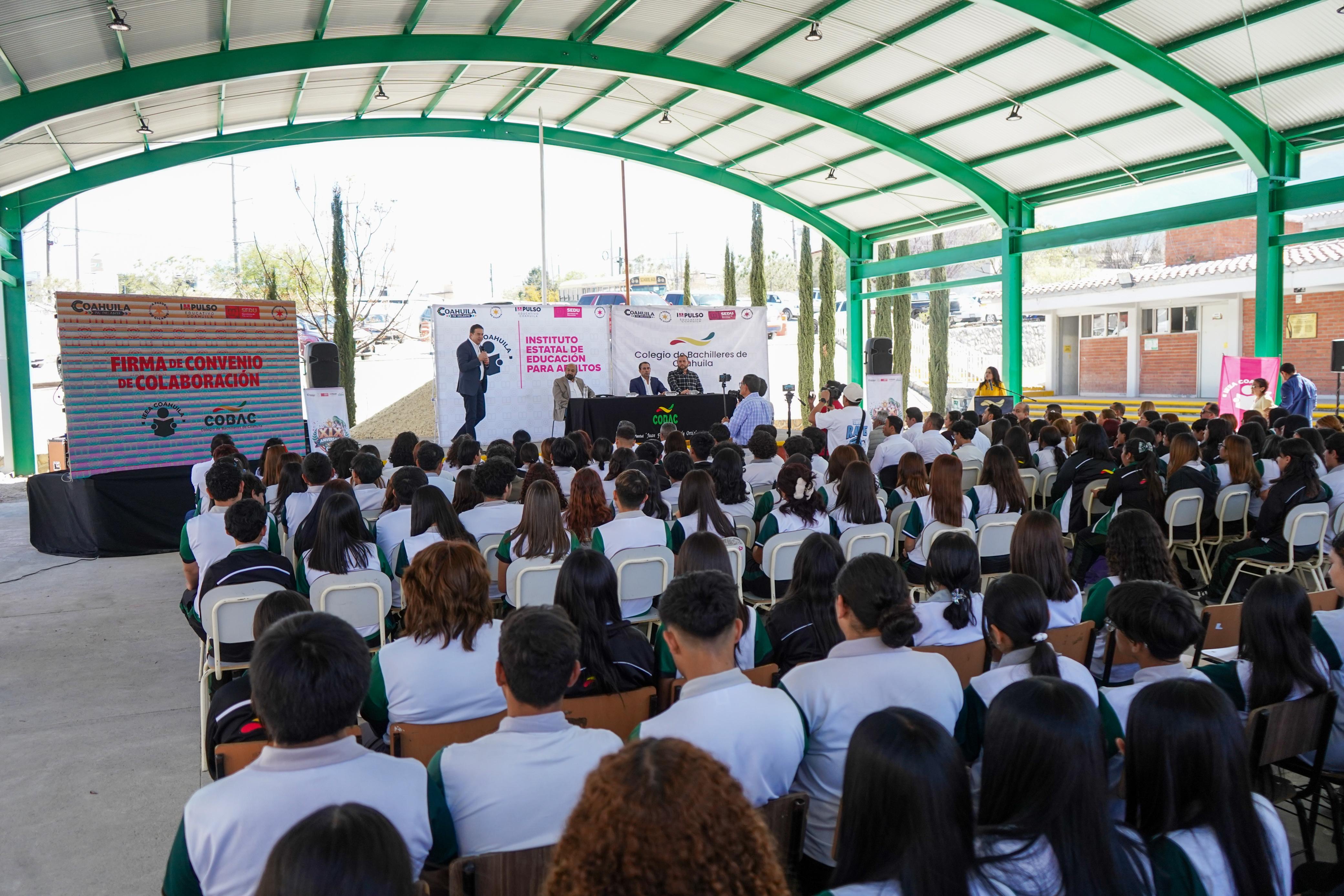 Saltillo, Coah., 1 de marzo de 2026.- En seguimiento a la política educativa del gobernador Manolo Jiménez Salinas y en coordinación con el secretario de Educación, Emanuel Garza Fishburn, el Instituto Estatal de Educación para Adultos (IEEA) y el Colegio de Bachilleres de Coahuila (COBAC) firmaron un convenio para que estudiantes realicen su servicio social apoyando los programas de alfabetización y educación básica dirigidos a jóvenes y adultos.