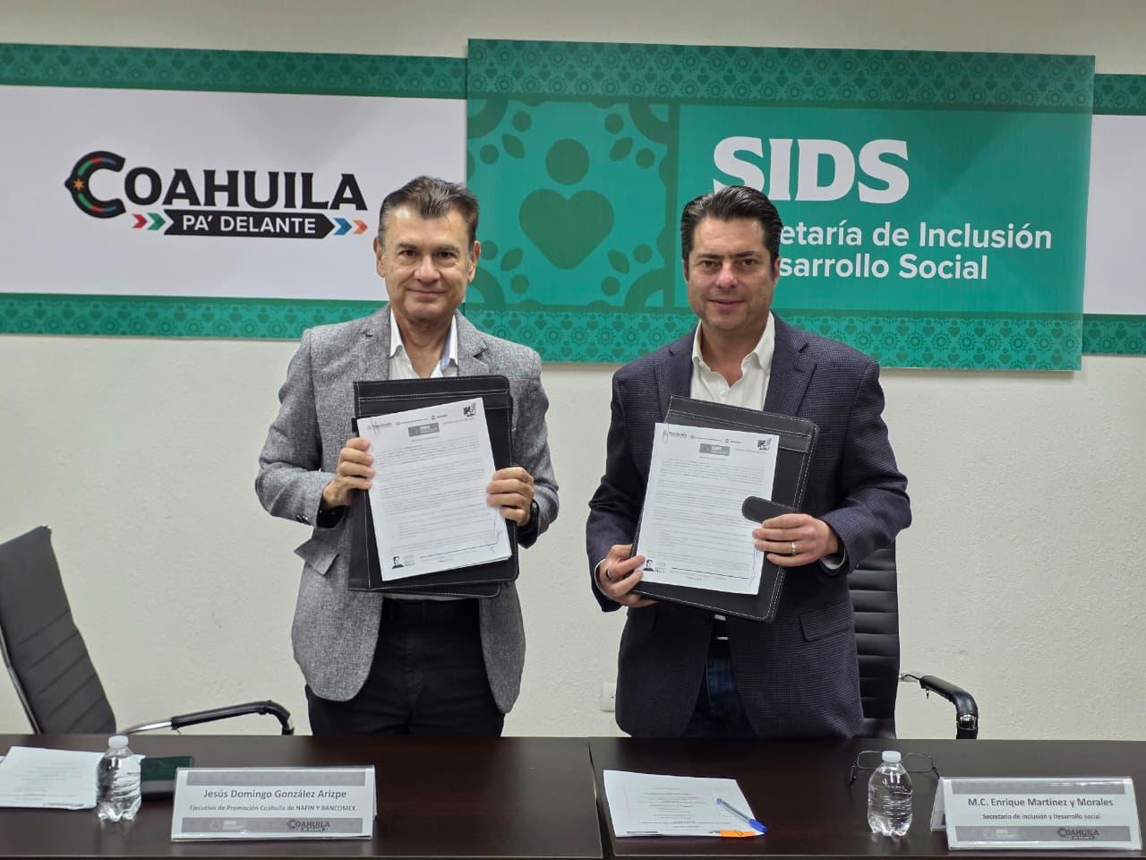 Saltillo, Coah., 26 de marzo de 2026.- El secretario de Inclusión y Desarrollo Social, Enrique Martínez y Morales, encabezó la firma de un convenio de colaboración con Nacional Financiera (NAFIN) y el Banco Nacional de Comercio Exterior (BANCOMEXT), con el propósito de fortalecer las oportunidades de desarrollo económico en el estado mediante el impulso al emprendimiento.